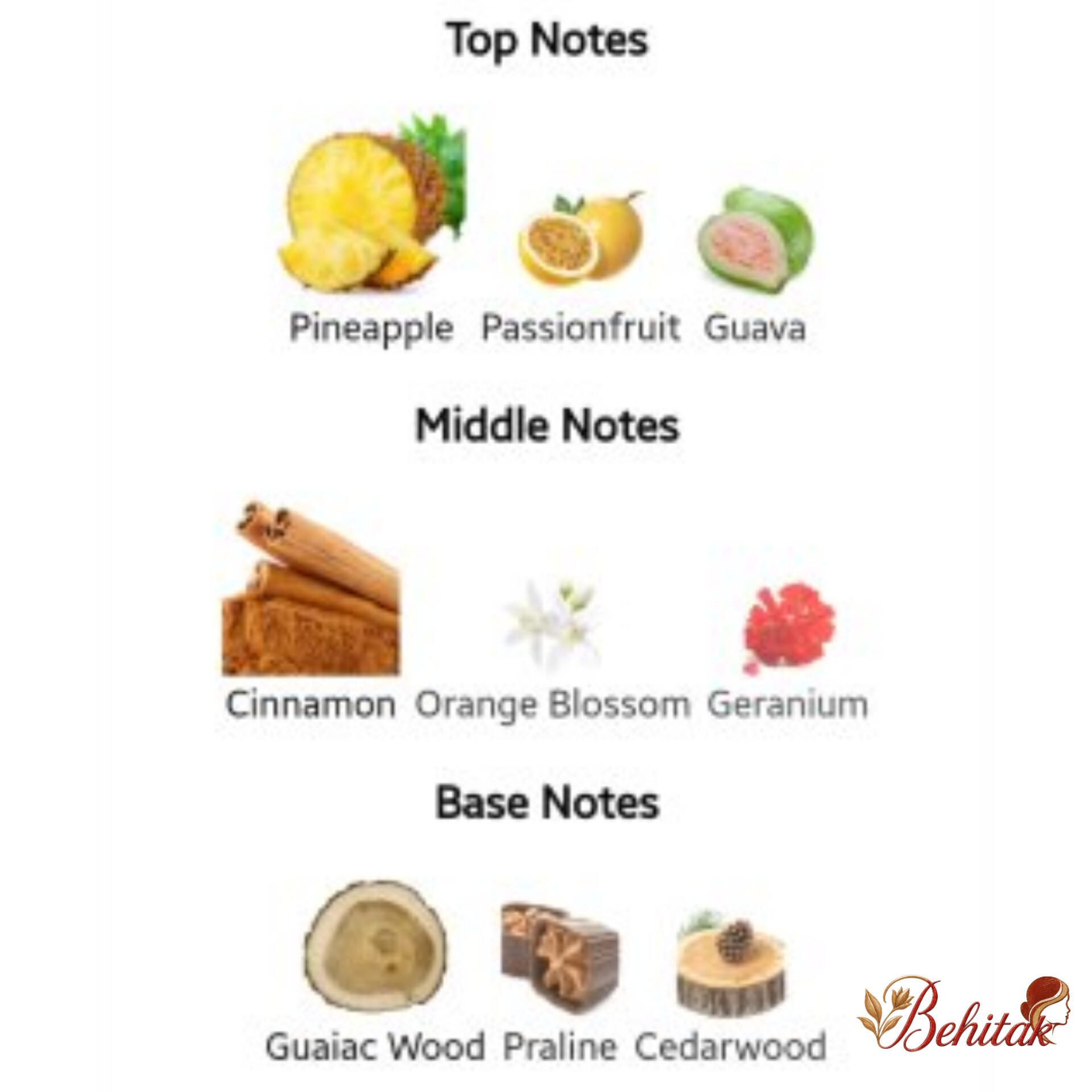 رایحه میانی: دارچین، شمعدانی، شکوفه پرتقال
