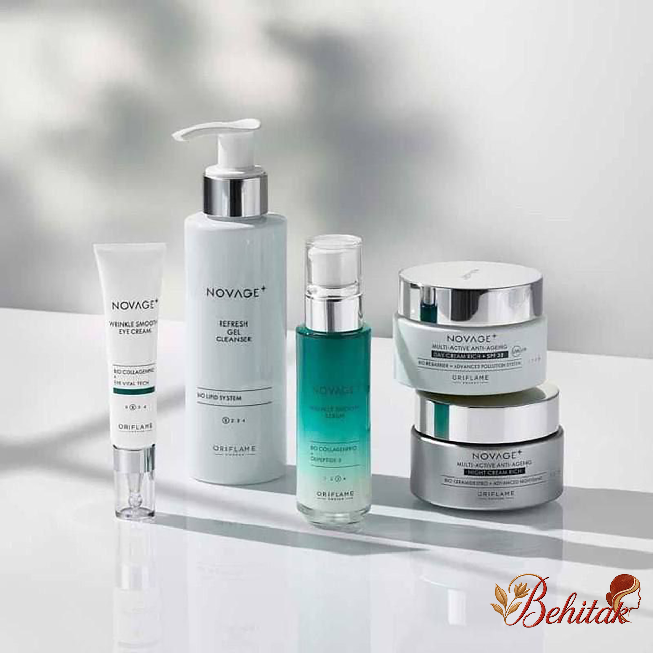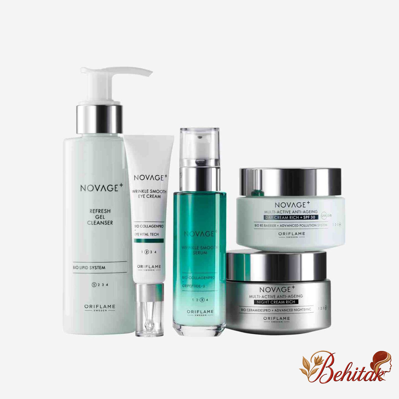 ست مراقبت پوست ضدچروک نوایج پلاس با پنج محصول در حجم استانداردیک ست مراقبت پوست قوی و چندکاره با هدف قرار دادن خطوط و چروک های عمیق، با تکنولوژی Bio CollagenPro با عملکردی مشابه رتینول و Oripeptide-3جهت فعالسازی کلاژن سازی طبیعی پوست، موثر بر هر چهار نوع چروک پوست، شامل کلینزر، کرم دورچشم، سرم، کرم روز ریچ و کرم شب ریچ، مناسب انواع پوست حتی پوست حساس